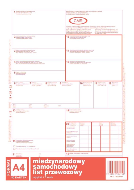 Bloczek międzynarodowych listów przewozowych CMR w formacie A4, zawierający 80 kartek (oryginał + 3 kopie).
